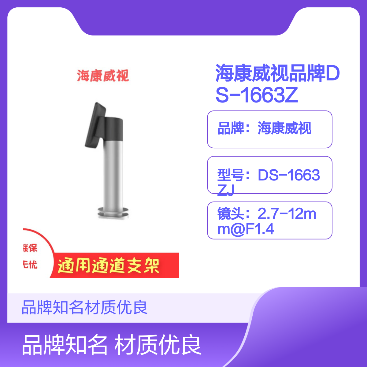 品牌:海康威视型号:DS-1663ZJ材质:铝合金颜色:白色镜头:2.7-12mm@F1.4水平视场角:98°-28°°安装方式:吊装是否支持加工定制:否是否进口:否生产厂家:浙江杭州海康威视质保:全国联保质保2年水平旋转角度:0-355垂直旋转角度:0-75功能:支持日夜转换、移动测速、报警等产品分类:吊装支架适用范围:适用于各种需要吊装的监控场景特色服务:厂家直销类型:支架是否支持红外:否用途范围:安防监控设备吊装使用