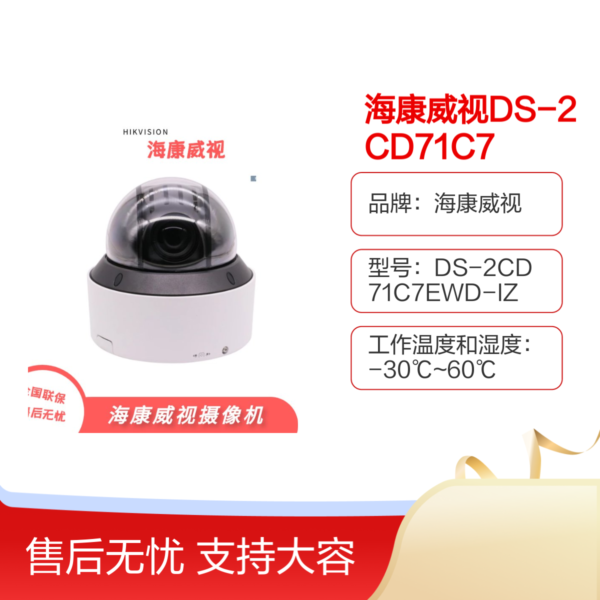 品牌:海康威视是否支持加工定制:否是否进口:否电源:DC12±20%/PoE(802.3af)工作温度:-30~60工作湿度:湿度小于95%(无凝结)功耗:12MAX重量:1400g质保:全国联保质保2年生产厂家:浙江杭州海康威视类型:半球型网络摄像机型号:DS-2CD71C7EWD-IZ视频分辨率:1200万功能:日夜监控用途范围:安全防护产品分类:安防监控设备输入电压范围:DC12V±20%电源接口类型:两线式电源接口