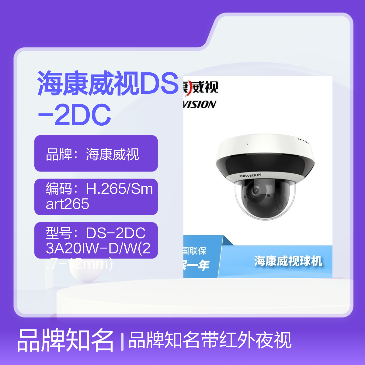品牌:海康威视是否支持加工定制:否是否进口:否是否支持红外:支持安装方式:自带支架安装安装环境:适用于多种场合尺寸:3寸存储备份方式:插卡存储是否支持电脑监控:是分辨率:200~400万功能:声光报警,智能侦测红外灯照射距离:50米画质:高清计量单位:台款式:PTZ球机类型:无线录像分辨率:1080P~4MP水平旋转角度:350特色服务:厂家直销型号:DS-2DC3A20IW-D/W(2.7-12mm)