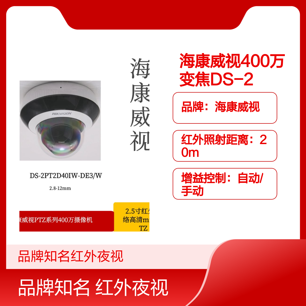 品牌:海康威视是否支持加工定制:不支持是否进口:否是否支持红外:支持红外灯照射距离:20m背光补偿:支持是否支持电脑监控:是分辨率:400万功能:变焦,红外,日夜模式等画质:高清镜头:2.8-12mm,4倍光学变倍类型:网络摄像机像素:400型号:DS-2PT2D40IW-DE3/W用途范围:安全防护,监控产品分类:安防监控设备;监视器