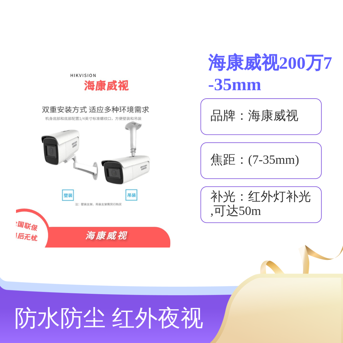 是否支持红外:支持, 红外灯补光,可达50m