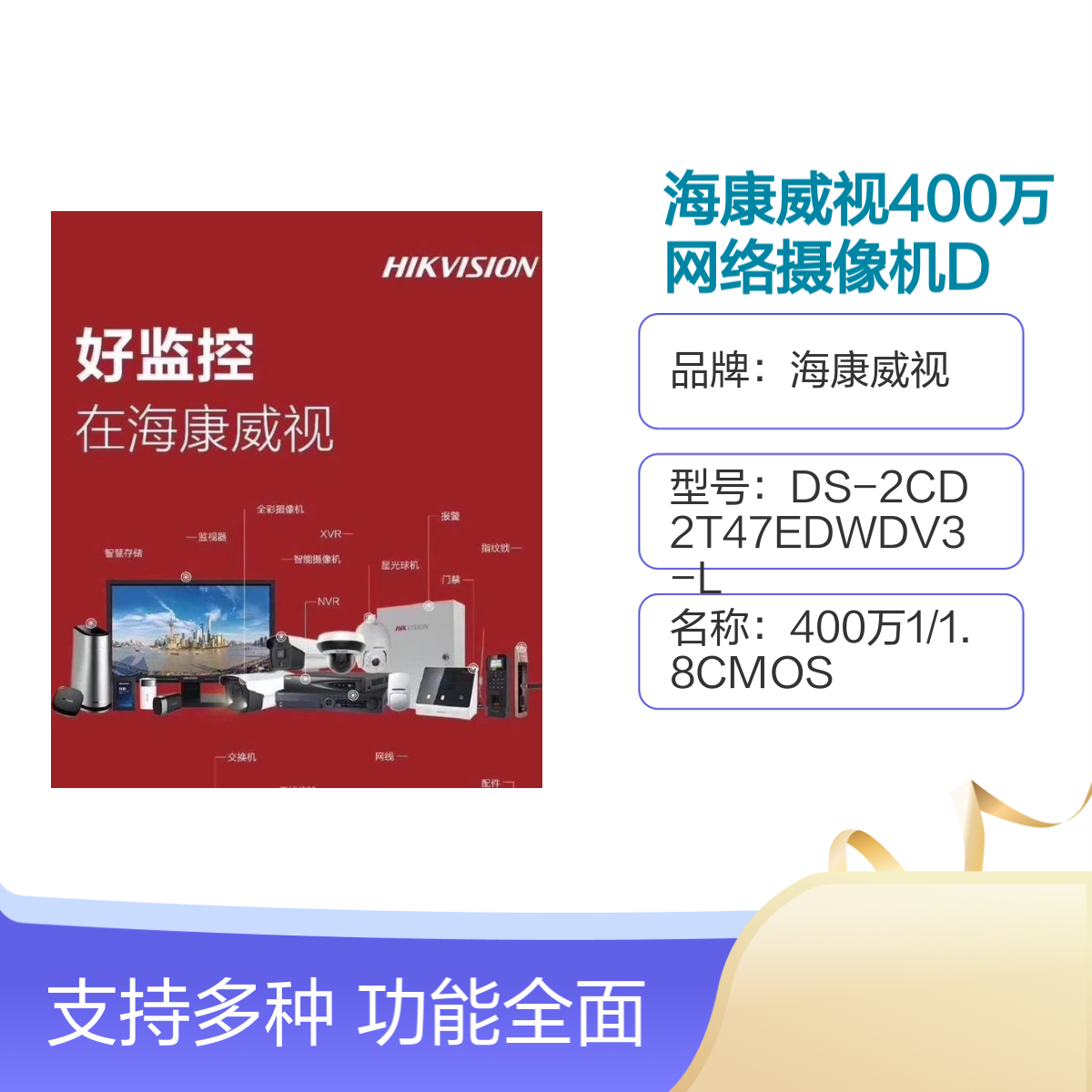 功能:400万1/1.8CMOS全彩筒型网络摄像机