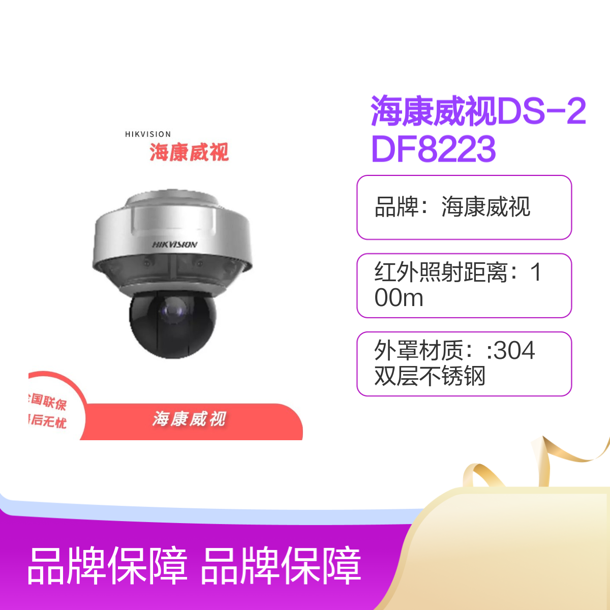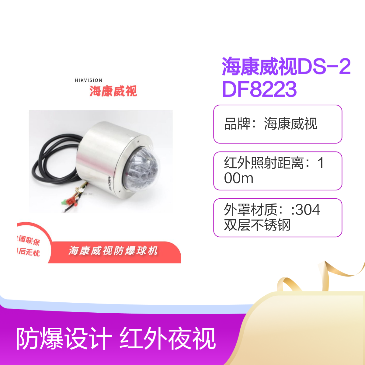 品牌:海康威视是否支持加工定制:否是否进口:否是否支持红外:是材质:304双层不锈钢是否支持电脑监控:是电压:AC220±10%电源:AC220±10%,80WMax分辨率:200万工作电压:AC220V±10%功率:80Max功能:红外、防爆红外灯照射距离:100m计量单位:台类型:防爆云台球机是否支持实时画面:是像素:200型号:DS-2DF8223IW-CWX重量:22Kg产品分类:安防监控设备
