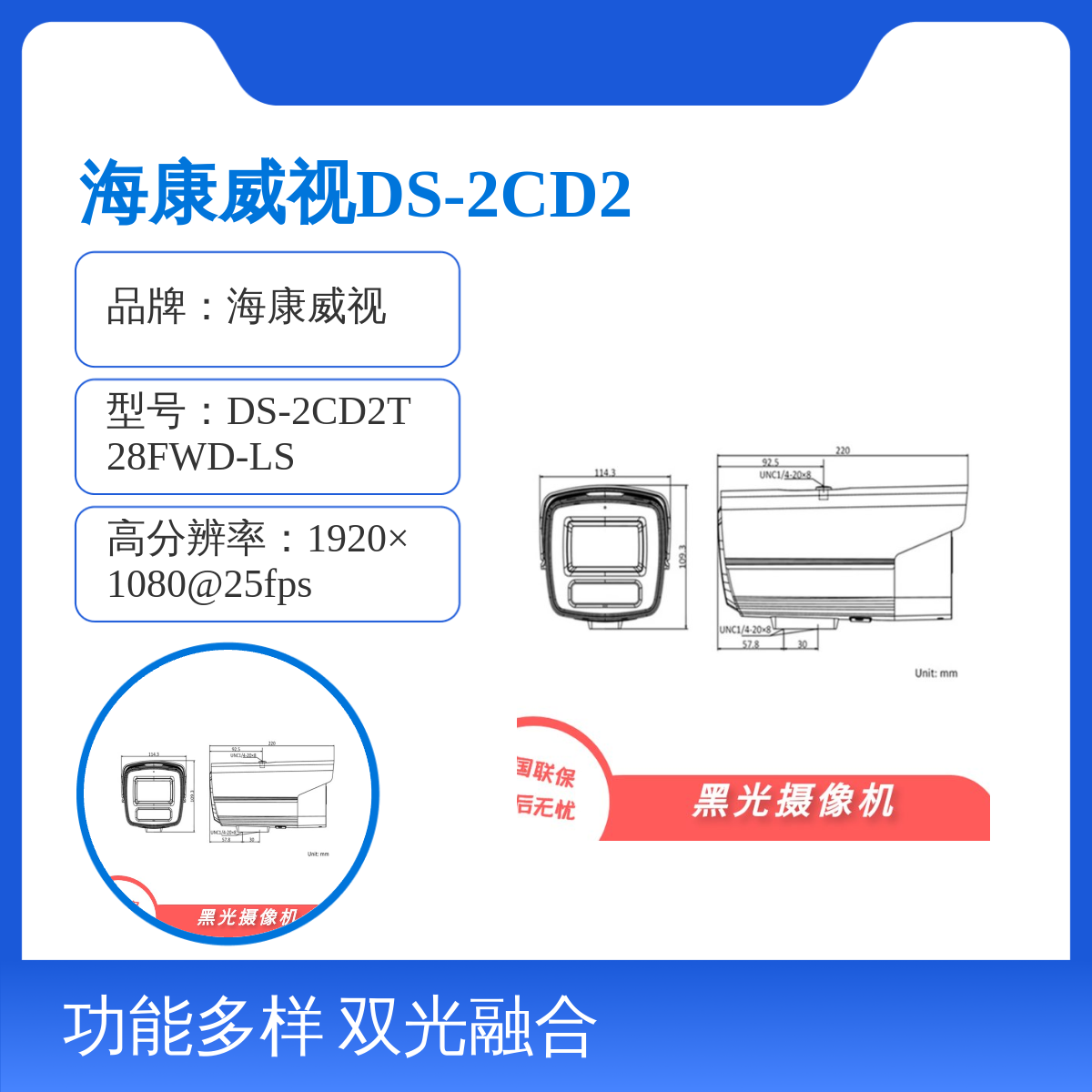 品牌:海康威视型号:DS-2CD2T28FWD-LS是否支持加工定制:否是否进口:否安装方式:壁装/吊装安装环境:室外背光补偿:支持背光补偿,适应不同监控环境是否支持电脑监控:是分辨率:1920×1080@25fps工作原理:采用双镜头和双光融合技术功能:心跳,镜像,一键恢复等红外灯照射距离:50m画质:高清适用范围:安全防护,安防监控产品分类:监视器