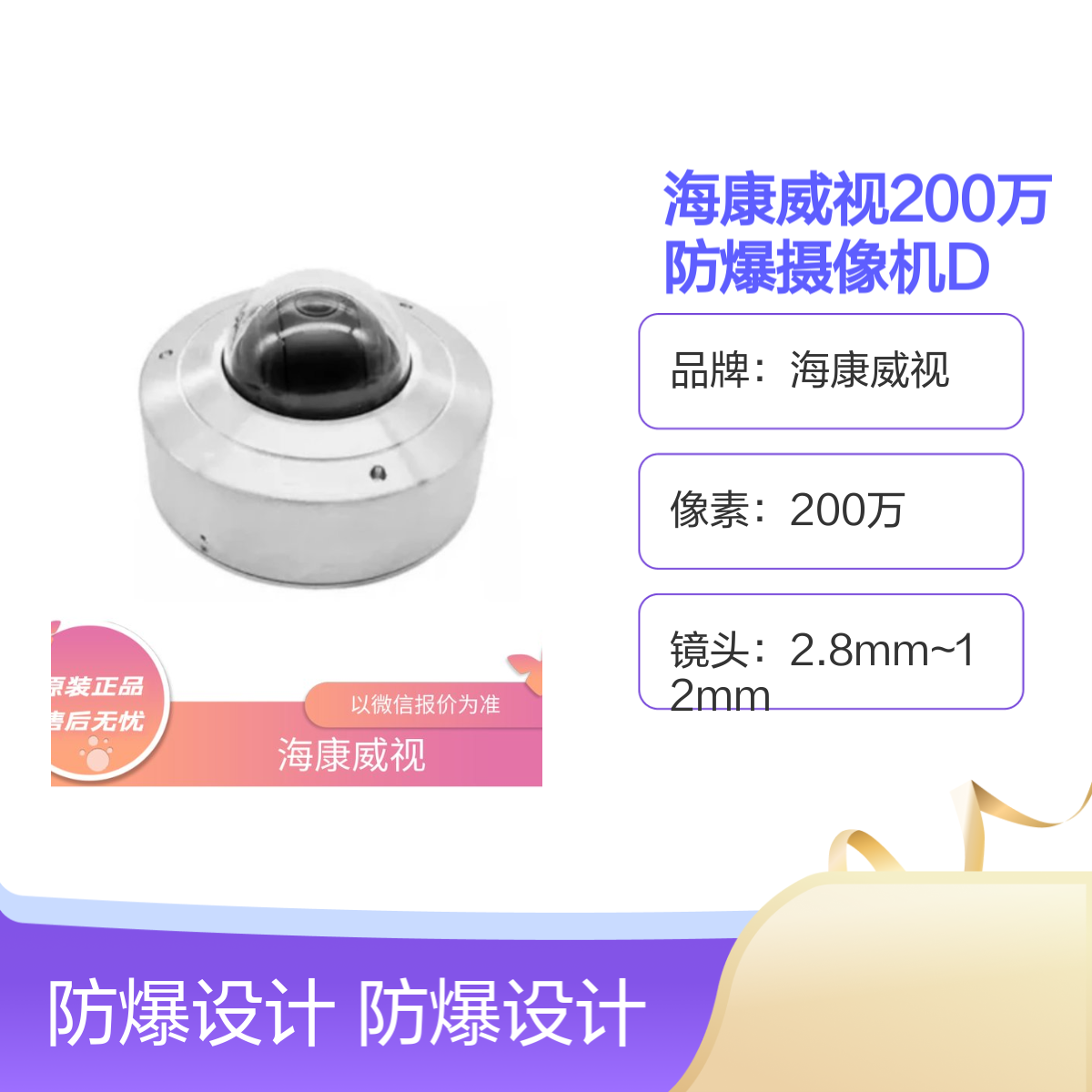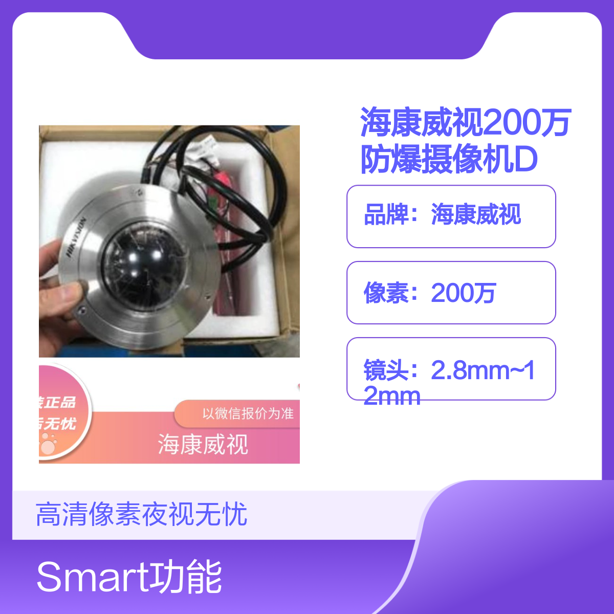 品牌:海康威视是否支持加工定制:否是否进口:否是否支持红外:是DC级别:DC12V安装环境:具有可燃性气体、蒸气与空气形成的爆炸性混合物场所背光补偿:支持尺寸:202x174x172mm带宽:小带宽看清大细节是否支持电脑监控:是电压:DC12电源:三芯接口分辨率:最高可达400W像素(2560x1440)工作湿度:小于95%(无凝结)工作温度:-30~60功能:录像、Smart功能、支持防雷、防浪涌、防静电等红外灯照射距离:可达30米镜头:2.8mm~12mm