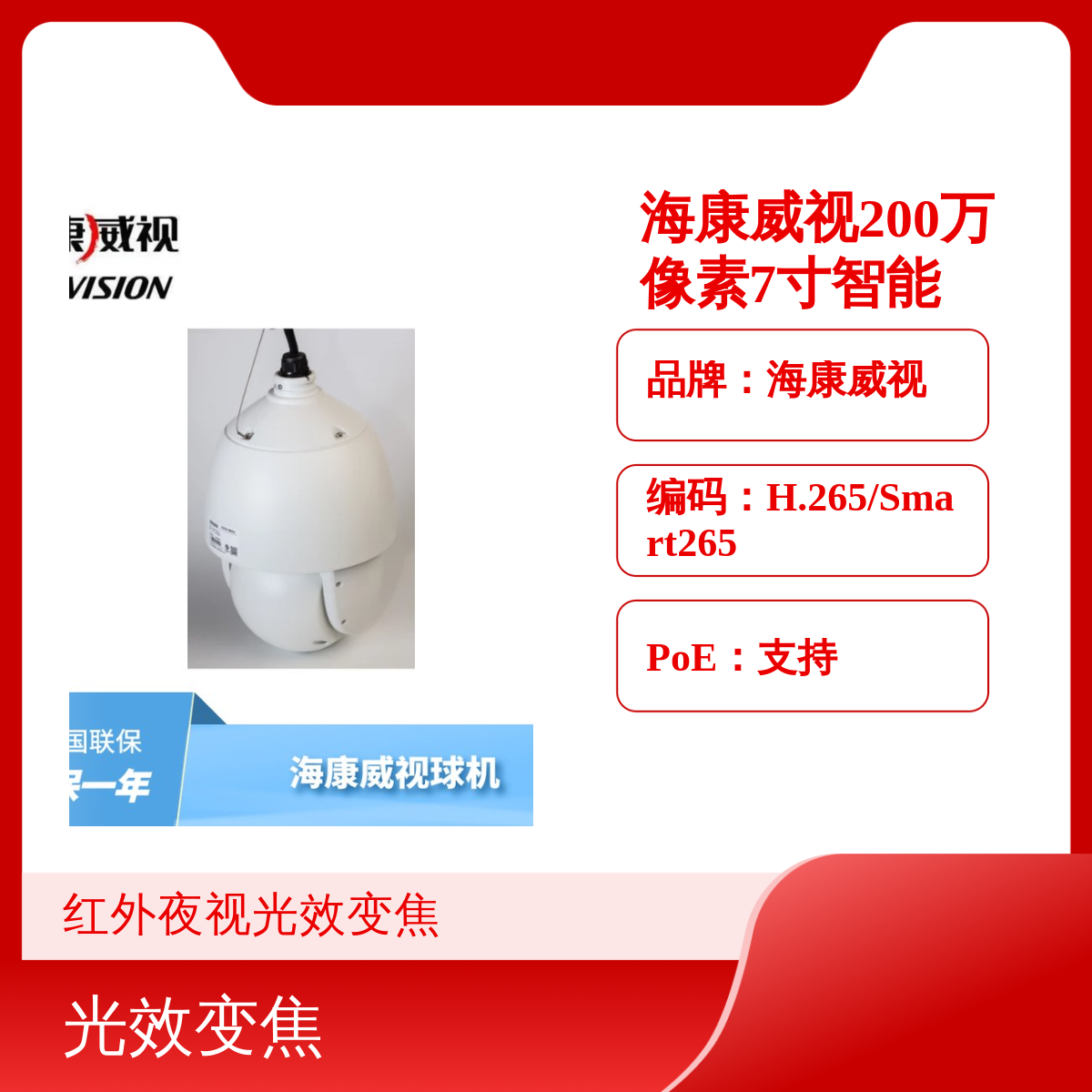 功能:红外夜视,光效变焦变倍,存储减半,移动监测,P66级防水防尘,昼夜自动切换,支持手机远程