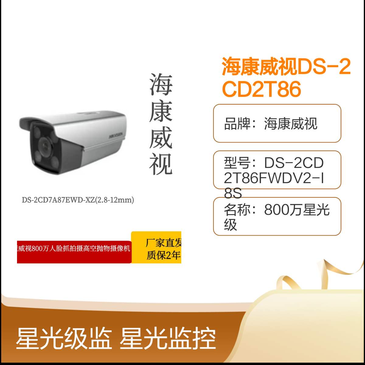 品牌:海康威视型号:DS-2CD2T86FWDV2-I8S是否支持加工定制:不支持是否进口:否是否支持红外:不支持DC级别:无安装方式:壁挂式安装环境:室外背光补偿:无材质:金属尺寸:186.6x93.5x92.9mm是否支持电脑监控:支持分辨率:800万功耗:无