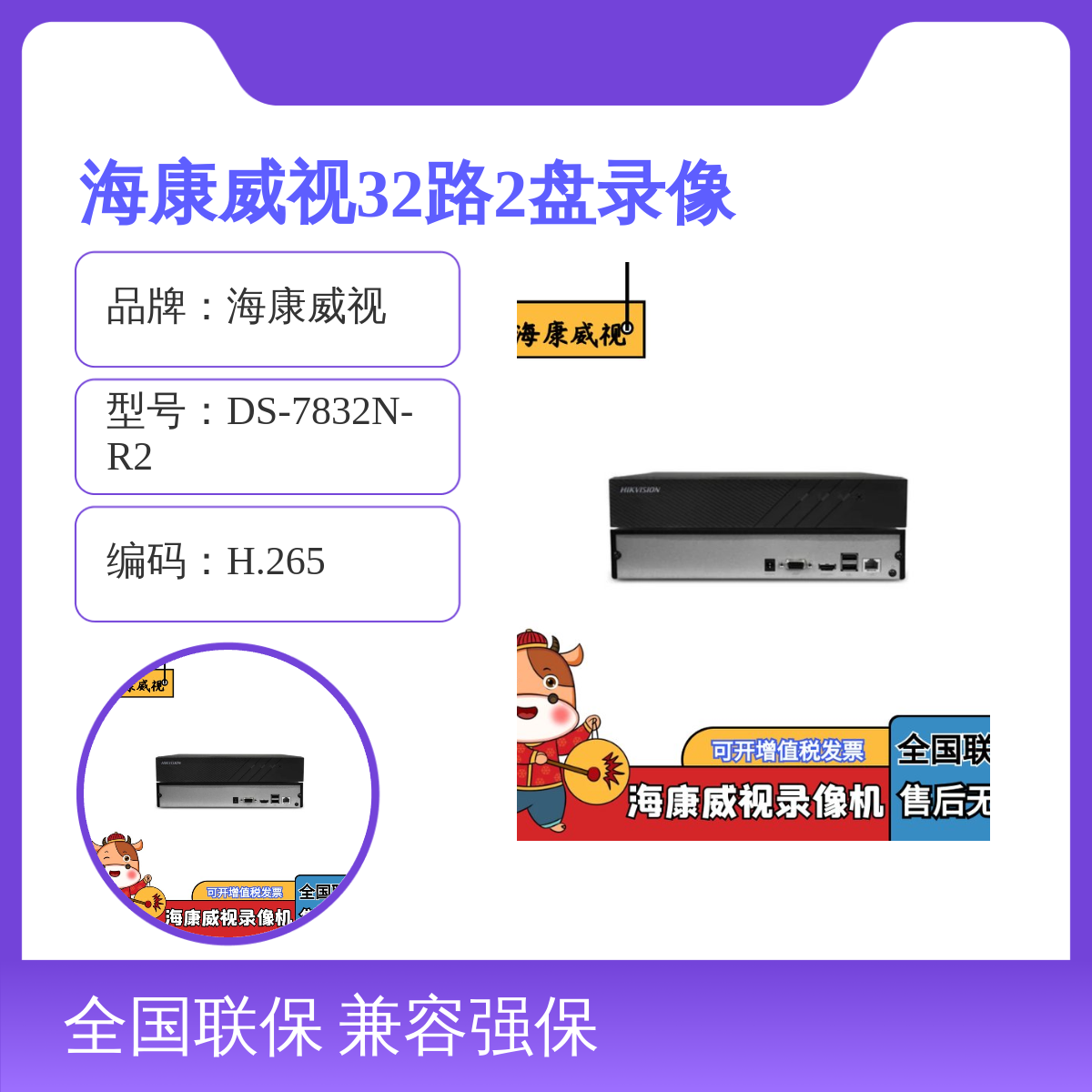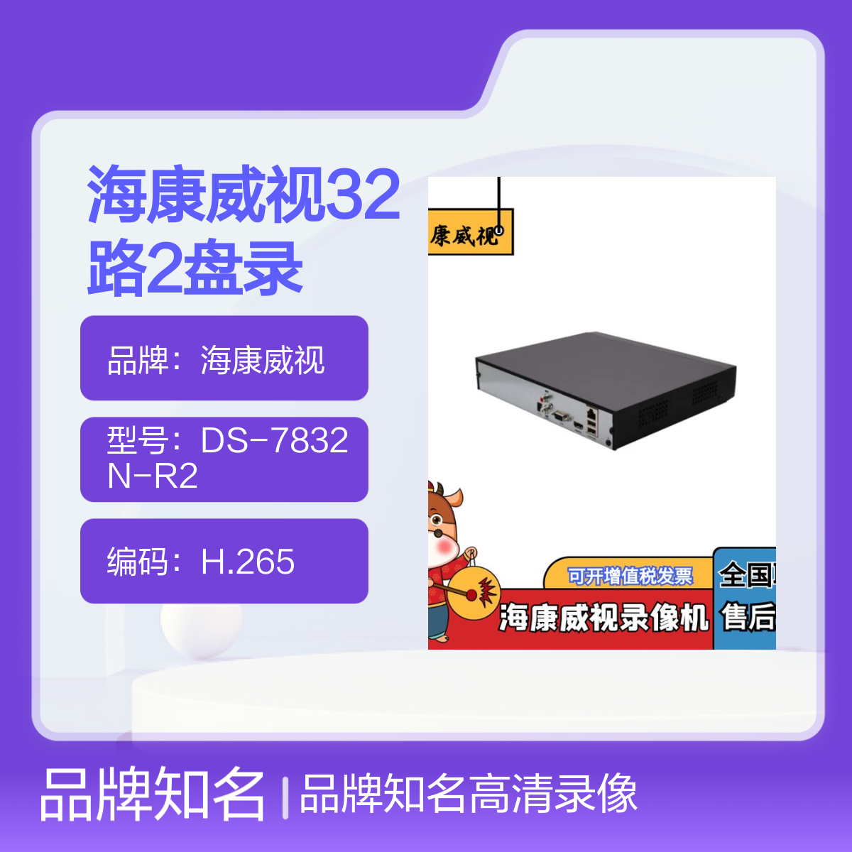 品牌:海康威视型号:DS-7832N-R2是否支持加工定制:否是否进口:否编码:H.265视频输入路数:32路视频输出:支持HDMI与VGA同源输出视频分辨率:最高可达1920X1080P功能:支持电子放大,移动智能侦测报警,即时回放录像方式:全天候不间断录像录像分辨率:最高支持400w像素是否支持实时画面:是硬盘容量:支持6T灵活设置硬盘最大容量:满接8T盘位:插入2个硬盘生产厂家:浙江杭州海康威视可售范围:全国可厂家直发用途范围:安全监控特色服务:厂家直销
