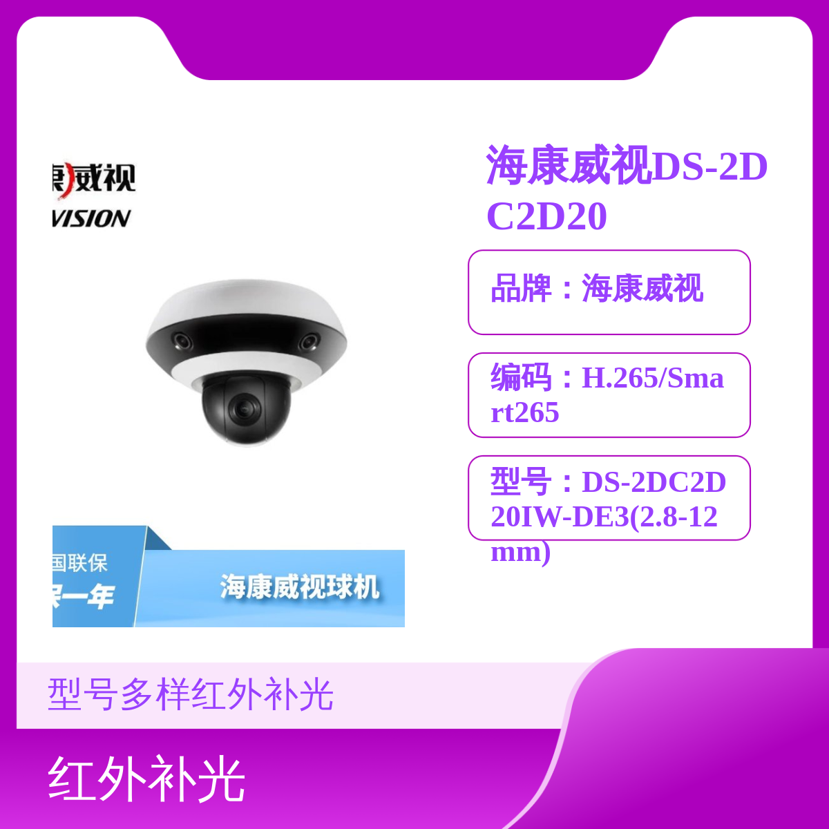 品牌:海康威视编码:H.265/Smart265型号:DS-2DC2D20IW-DE3(2.8-12mm)补光:红外补光10防水等级:IP66降噪:支持3D数字降噪,支持120dB真宽动态可售范围:全国质保:全国联保,保修一年