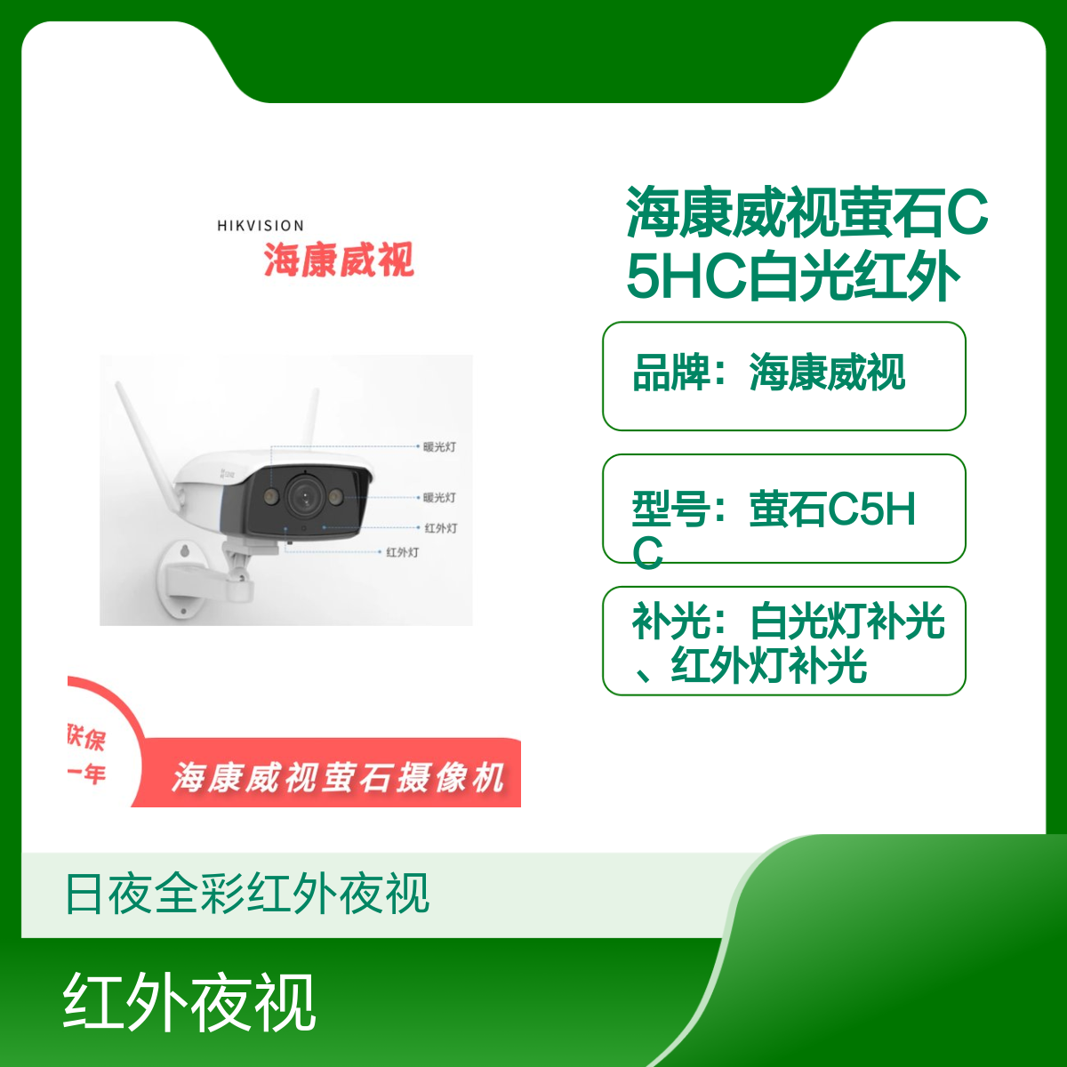 品牌:海康威视型号:萤石C5HC是否支持红外:支持补光:白光灯补光、红外灯补光安装环境:室外拾音:5米拾音分辨率:1920×1080功能:日夜全彩监控,人形检测,主动防御(闪光震慑),远程拾音红外灯照射距离:50米画质:1080P高清镜头:4 mm / 6 mm / 8 mm可选是否支持实时画面:支持视频分辨率:1080P视频压缩方式:智能H.265/H.264像素:200用途范围:家用网络手机夜视监控质保:全国联保防水等级:IP67