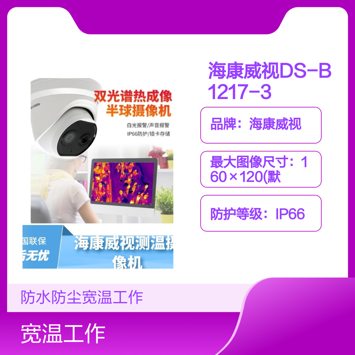 品牌:海康威视最大图像尺寸:160×120(默认输出320×240)防护等级:IP66工作温度和湿度:-40℃~70℃,<95%RH测温范围:-20℃~150℃客户端:iVMS-4200/萤石/HIK-CONNCET质保:全国联保质保2年厂家:浙江杭州海康威视型号:DS-B1217-3/PA