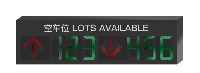 灯箱上部分镂空显示“空车位”字样,下部分LED 8字屏显示动态箭头及剩余车位数